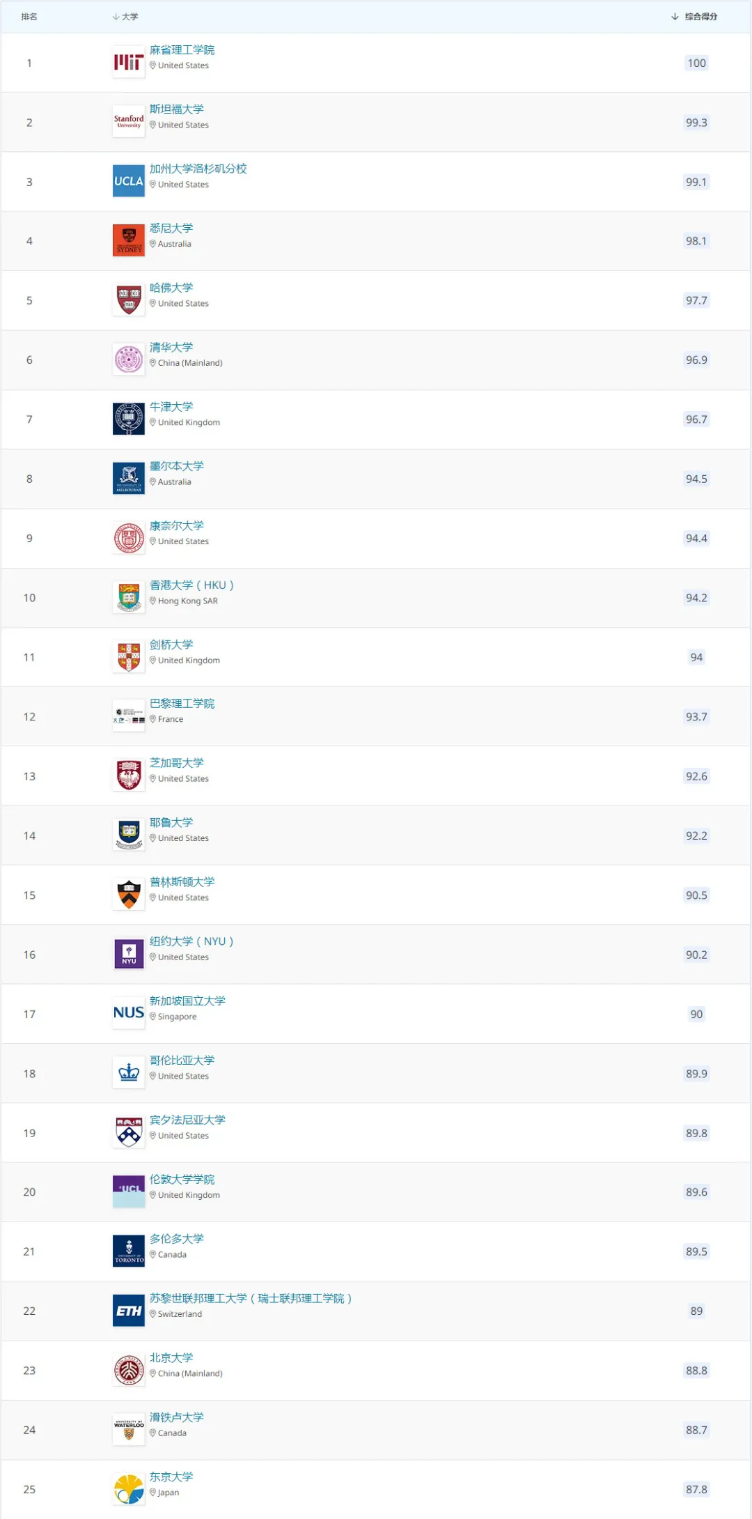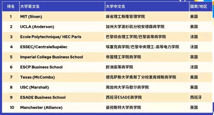 榜單前三名連續(xù)3年保持不變,且都來自美國,分別是麻省理工學(xué)院、斯坦福大學(xué)和加州大學(xué)洛杉磯分校。