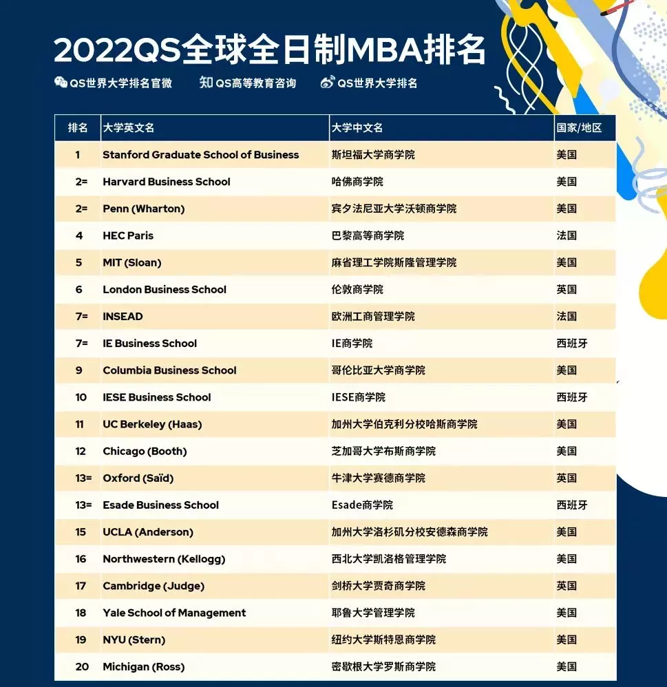 近日世界著名大學(xué)排行榜之一QS(Quacquarelli Symonds),發(fā)布了2022年最新全球全日制MBA以及商科碩士排名。