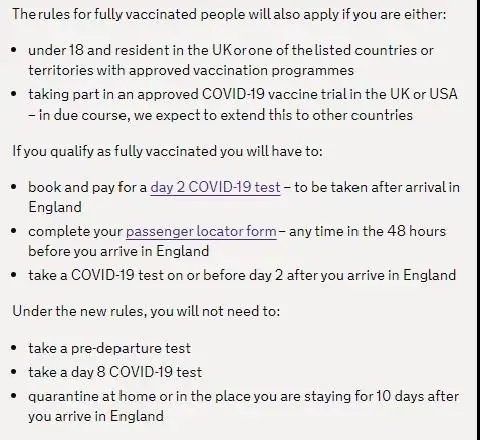 從紅色名單以外的國家入境英國,若入境者已完成了兩劑疫苗的接種,則不需要進(jìn)行出發(fā)前的新冠檢測、到達(dá)英國后的第八天的檢測、以及到達(dá)英國后10天的隔離。