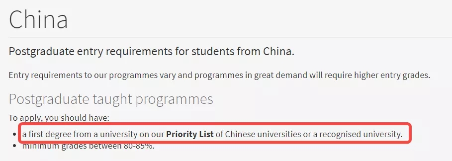 此外,也有英國大學(xué),比如愛丁堡大學(xué),直接給出一份中國大學(xué)名單,明確表示僅接受來自名單中的大學(xué)的申請者: