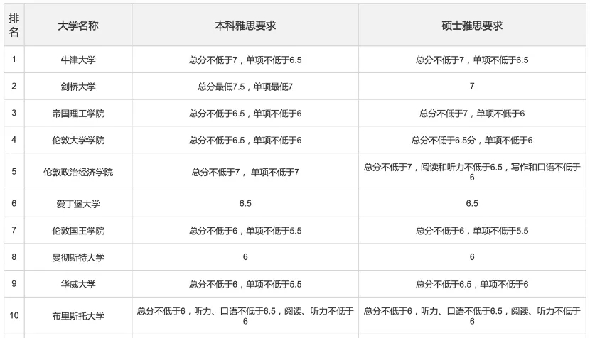 英國作為雅思考試的發(fā)源地與大本營,2021全球大學(xué)排名中英國大學(xué)TOP50均接受雅思成績,甚至有不少排名靠前的學(xué)校僅要求總分6.5分及以下,部分對單項(xiàng)分?jǐn)?shù)有一定的規(guī)定。英國留學(xué)