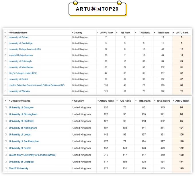 在2021年度ARTU排名中,排名前10的大學大多是美國院校,前三分別為:哈佛大學、斯坦福大學、MIT。英國的牛津和劍橋兩大名校也有上榜全球10強。