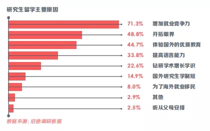從上圖可以看出,大部分選擇同學出國深造最終目的是增加就業競爭力。隨著社會進步和發展,各企業對員工的要求也越來越高,尤其是大公司/知名企業。雖然國家號召985或211的硬性門檻要求逐漸被淡化,但是“隱形門檻”仍然存在,若選擇國外排名較高的大學深造讀研,可以有效地彌補學歷背景上的不足,提高個人競爭力。