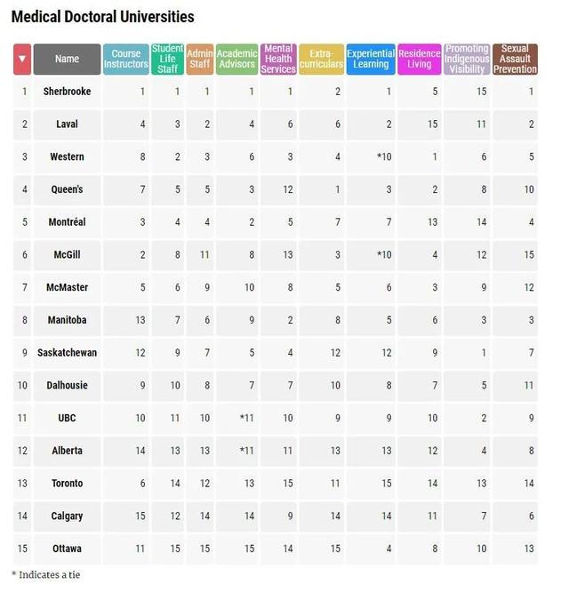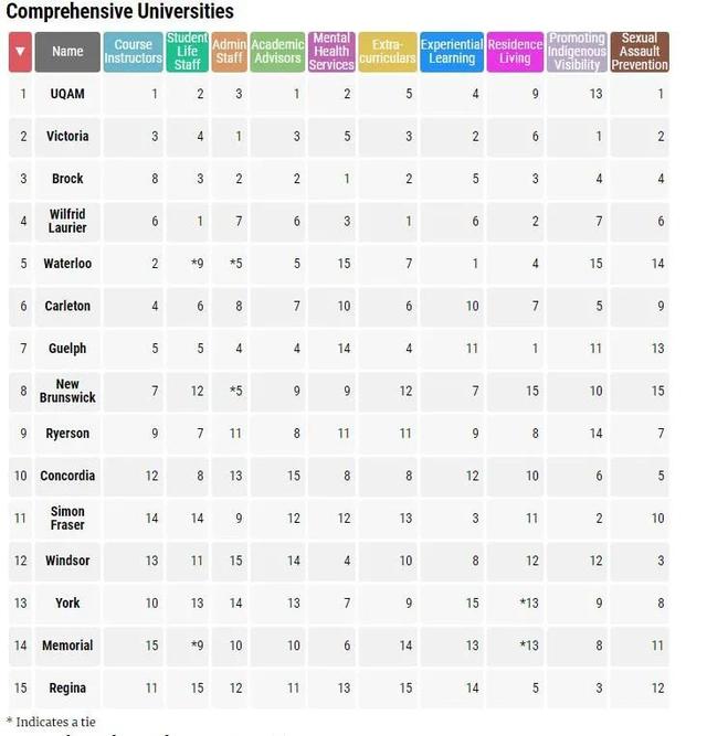 對比去年,去年的第一名圭爾夫大學跌到第七位,與去年的第四名魁北克大學今年奪冠!去年第八名的維多利亞大學躍升到第二位!而布魯克大學則是去年的第二名!有趣的是倒數三位的排名沒有改變!