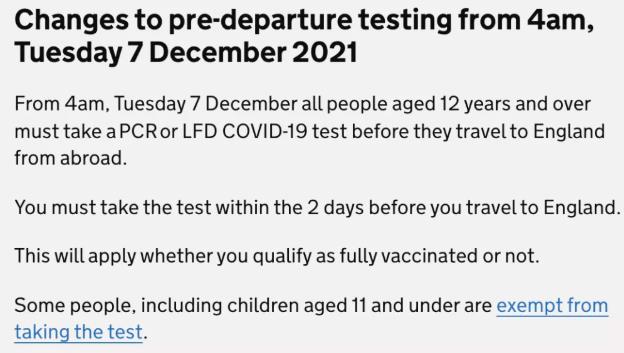 從12月7日(周二)清晨4:00開(kāi)始,所有國(guó)際入境者,哪怕是已經(jīng)完整接種過(guò)2針疫苗的人士,不僅在入境英國(guó)后需要居家隔離并進(jìn)行PCR檢測(cè)之外,在入境前還需進(jìn)行PCR或側(cè)向流動(dòng)測(cè)試,并提供陰性檢測(cè)證明。