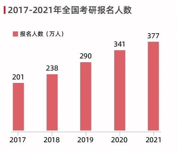 近年來全國考研人數持續增長、根據最近5年的數據,從2017年首破200萬大關起,考研報名人數連年攀升,到2021年達到377萬。5年間,考研報名人數翻了近一番。