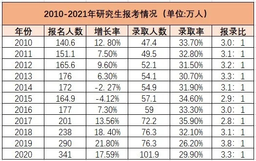 近十年來高居不下的高校畢業生規模,使就業形勢愈發嚴峻。大批找不到合適工作的應屆生加入考研隊伍。此外,二戰黨、在職黨也不斷涌入考研大軍,推高競爭激烈度。