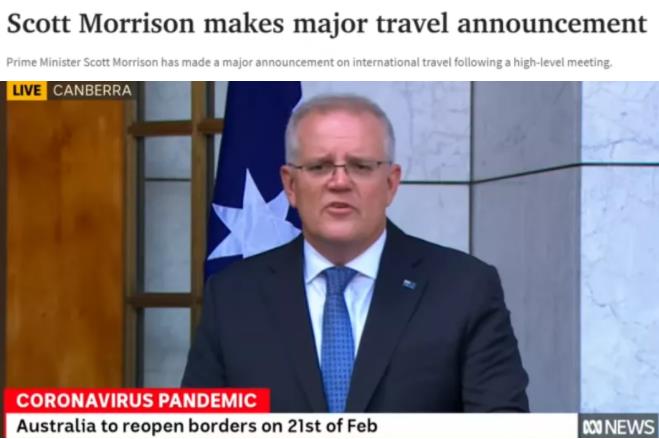 澳洲總理莫里森在周一下午召開記者會,宣布2月21日全面重開國境,已接種兩劑新冠疫苗的旅客持有效簽證即可入境。