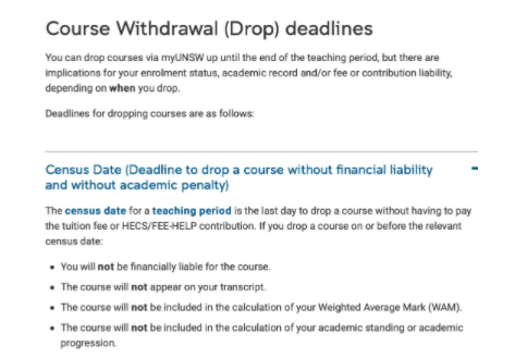 每個大學,甚至同一個學校的不同專業的Census date都會不盡相同,有打算要Withdraw課程的同學一定要注意查看好自己所在專業的Census date。一般來說,每門課的“Handbook”上可以查找到Census date;或者登錄本校的Student online portal,進入自己的學生登錄界面以后,在“Enrolment”功能下可以查找到Census date。