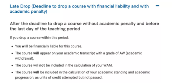 如果超過了Census date,我們依然想退課,那么還有兩個時間點需要注意。其中一個日期是會產生學費損失,但是不會產生學術損失的日期,在此日期之前退課,依然需要交納這門課的學費,但是這門課的成績不會出現在最終成績單上,在計算整體平均分的時候,這門課的分數也不會被計算在內。