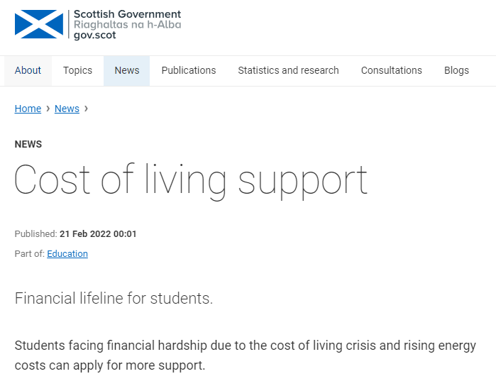 據蘇格蘭政府公開信息顯示,如高校學生遭遇生活成本危機,或因能源成本上升而面臨經濟困難,可以向學校申請財務補助。