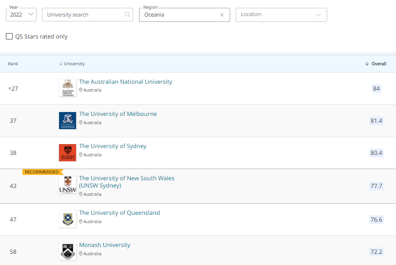 在2022年QS排名中澳洲國立大學依然高居榜首以No.27機身全球TOP30,墨爾本大學和悉尼大學緊隨其后分別排名NO.37, No.38,另外新南威爾士大學、昆士蘭大學和莫納什大學分別以No.43, No.47, No. 58位列全球TOP60。