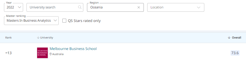 除此之外,悉尼大學商學院、莫納什商學院也在榜單上名列前茅,是在世界享有盛譽的商學院。悉尼大學商學院(The University of Sydney Business School)是澳大利亞最好和高考入學分數最高的商學院之一。在同時,是歐洲全球管理學教育聯盟CEMS的成員(每個國家或地區只有一所大學入選)。蒙納士商學院 (Monash Business School) 位居2022U.S. News排名第17位,全澳第1,是澳大利亞首個獲有AACSB、EQUIS和AMBA三重認證的商學院。
