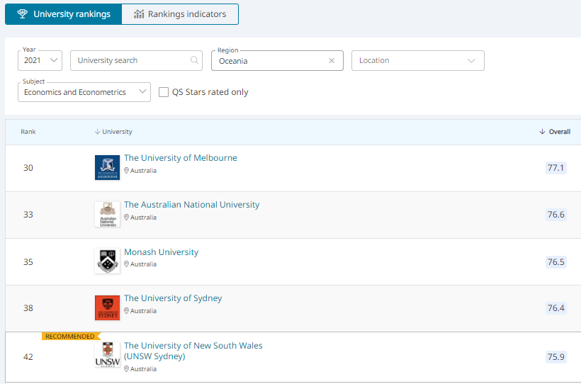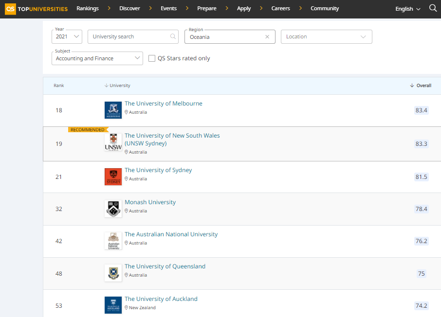 以下是會計與金融、商業與管理、經濟與計量經濟學專業澳洲大學QS排名: