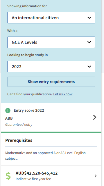 對于Bachelor of Commerce商科專業本科來說,墨爾本大學接受國際生以GCE A levels或IB成績申請。只要GCE考到ABB,并且提供符合要求的Mathematics(數學)和 A or AS level English (英語)成績都有機會被墨爾本大學Bachelor of Commerce錄取。持有IB成績的國際學生需要總分在36.00分以上,有符合條件的英語成績,并且SL或HL至少達到4分。