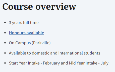 墨爾本大學Bachelor of Commerce為三年學制,2月或7月入學,可以在第一或第二學年選擇會計學、精算研究、經濟學、金融學、管理學或市場學進行學習,也可以選擇修兩門學科的課程。