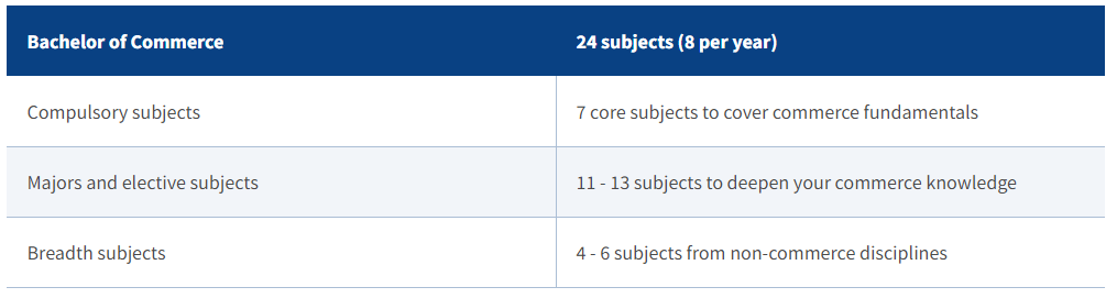 墨爾本大學Bachelor of Commerce須休滿24門課程,其中7門必修,11-13門根據選擇的專業修習的專業課程,以及4-6門公共選修課程。這7門必修課程分別為Introductory Microeconomics微觀經濟學基礎,Introductory Macroeconomics宏觀經濟學基礎, Principles Of Finance金融學原理, Accounting Reports And Analysis財務報表與分析, Quantitative Methods 1計量方法1, Quantitative Methods 2計量方法2, Organisational Behaviour組織行為學,專業選修課程根據選擇的專業不同而有所差別。