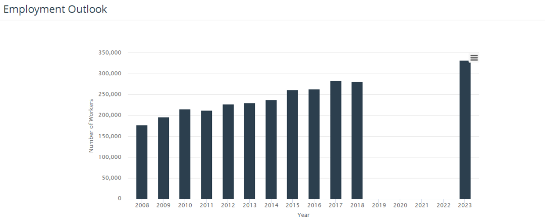 注冊護士在澳洲是從業人數最多的群體之一,統計數據顯示2018年注冊護士達到27.96萬,預測至2023年,護士就業人數將增長至33.01萬人,可以看出澳洲將來對于護士的需求量將非常高。