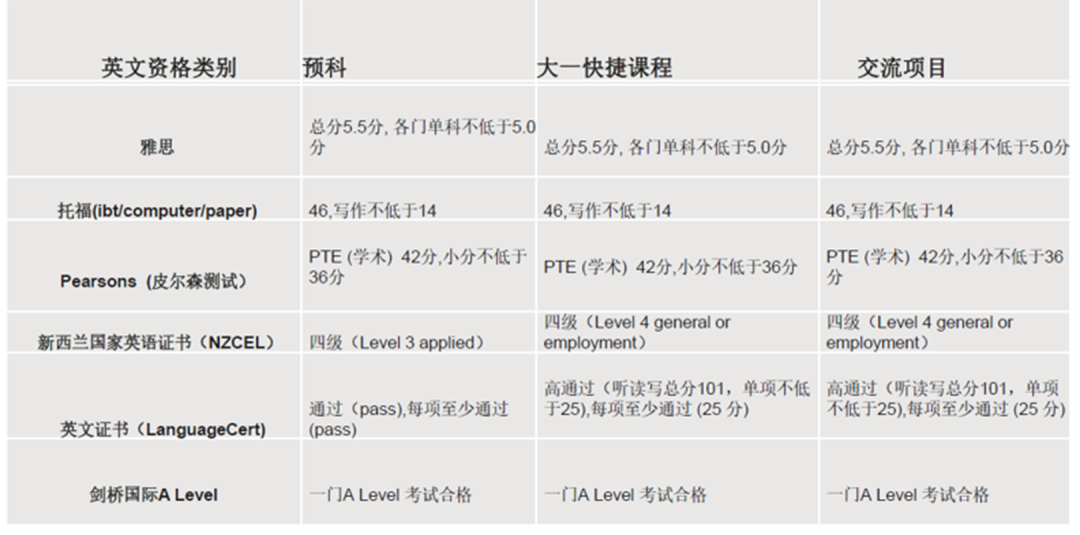 ?語言考試方面,除了雅思以外,UCIC也接受其他的語言種類,務求為廣大學子提供最為便利的入學途徑。具體語言種類及要求可見下表: