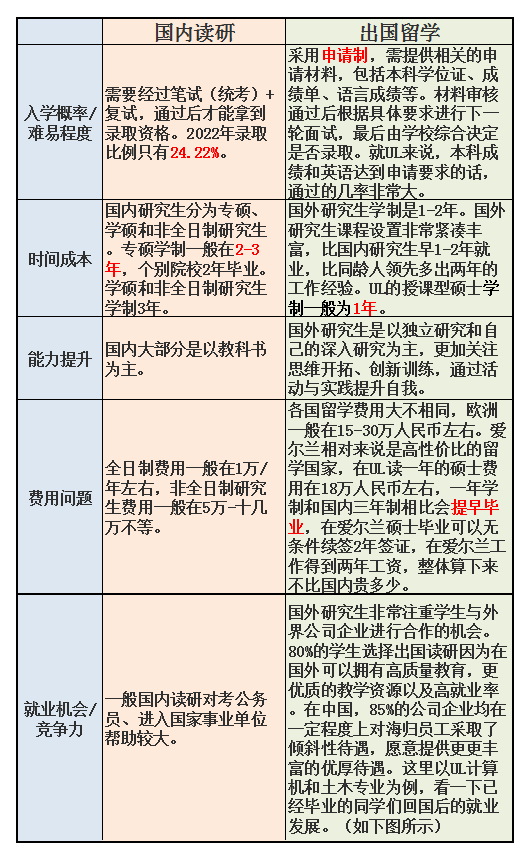 下圖從幾個方面體現國內讀研和出國留學的對比。