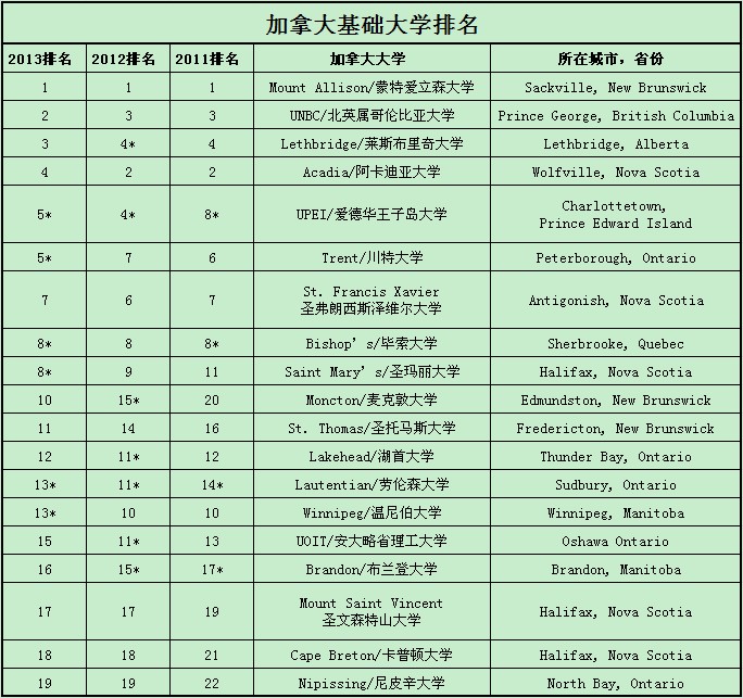 2013年11月1日《麥考林》雜志發布了最新一次的加拿大大學排名。由于加拿大政府機構不對大學進行官方排名,因此該排名已成為加拿大本土學生及國際學生了解加拿大大學的一份重要指南。