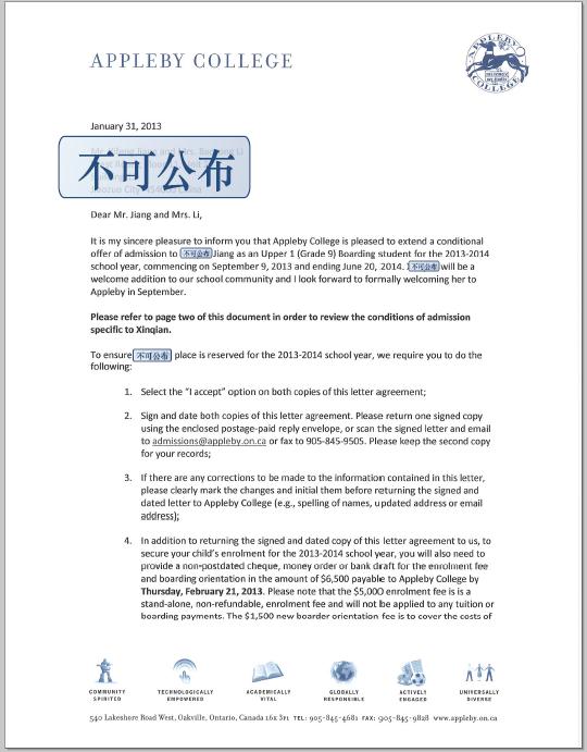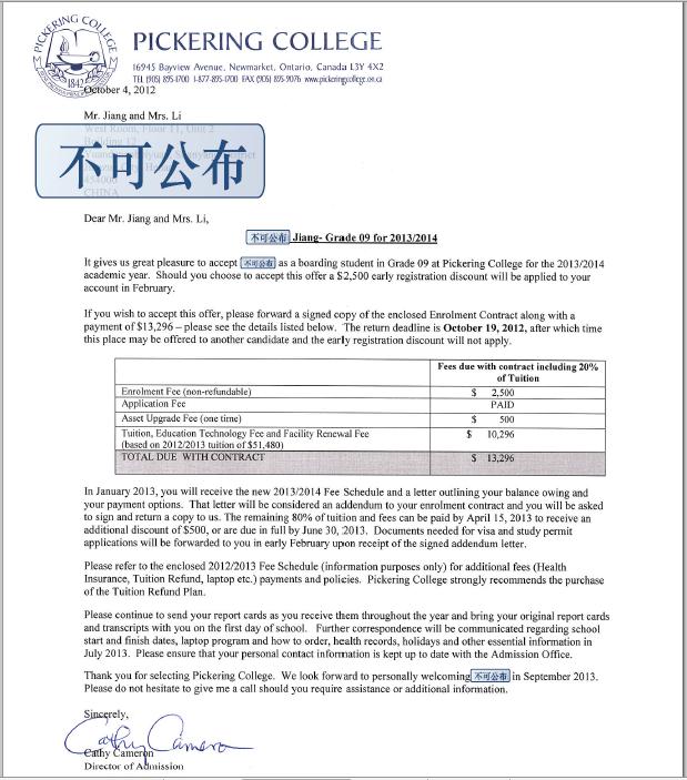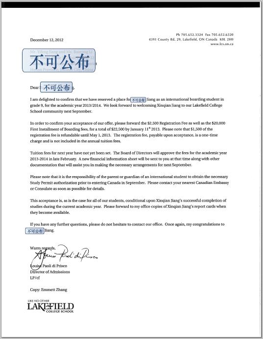 最后,附上三所學(xué)校的offer,大家沾沾喜氣:),學(xué)生家庭地址與具體名字已隱去,請理解。