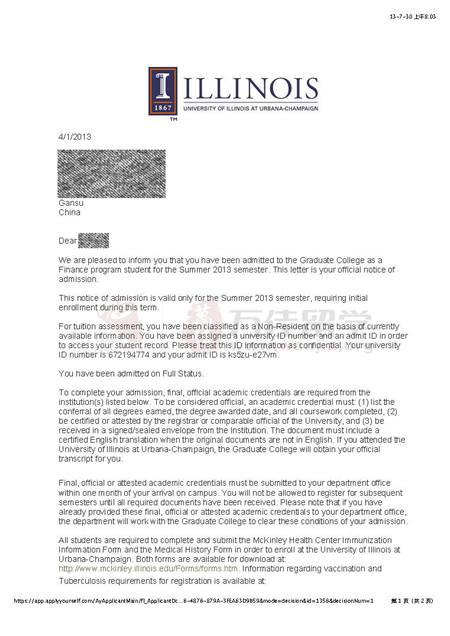 確定了目標和方向后,我就開始積極給Maria進行一系列全面細致的申請準備。2013年9月28日,在提交了申請后的一周內,Maria給我發了郵件:“Pepperdine應用金融學錄取,還有15000$獎學金!”我知道,這個浸潤著濃厚東方氣質的女孩還有她的家人可以靜靜享受著美好的時刻了!到后來,就又是UIUC向這個可愛的女孩拋出了橄欖枝。