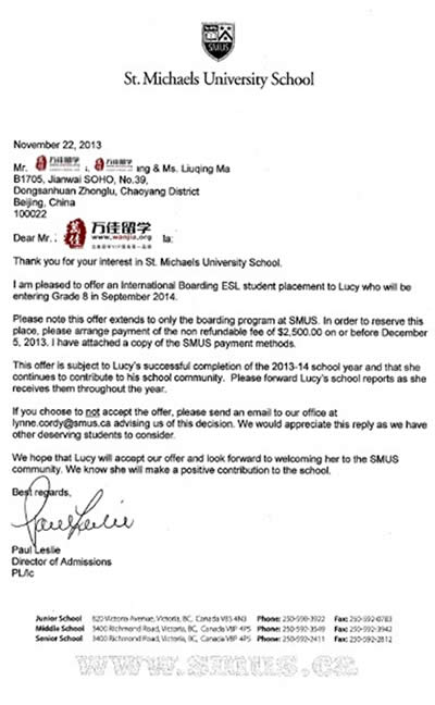 從2013年9月與我簽約。10月遞交申請,11月參加第一次SKYPE面試。12月份參加現場面試,并在12月份SSAT考出2100分,爸爸仍堅持說沒有考好,應該可以考更高。兩周后學校發來郵件通知LUCY已經被圣邁克錄取。回顧簽約到拿到OFFER這個過程。第一,因為簽約時間非常早,學校那邊剛開放申請就已經把所有材料遞交學校。學校第一時間拿到了學生的申請,所以才11月份就有了第一次SKYPE面試。