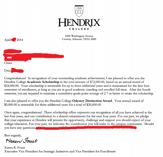 4月20日,早晨一打開郵箱,映入我們眼簾的便是Kate同學的offer,打開郵件,結果讓我們大吃一驚。Hendrix admitted!9萬2千美金的獎學金!除了激動還是激動...